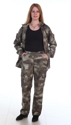 Костюм летний женский "Амазонка" выполнен из ткани 100% хлопка. Куртка на молнии, приталенного кроя с эластичными вставками по бокам для более плотного прилегания к талии. На куртке имеется четыре кармана: два накладных на рукавах и два нижних с клапанами с застежками на кнопку. Капюшон, низ куртки и низ брюк регулируется резинкой с фиксаторами. Манжеты на рукавах и пояс брюк на резинке. На брюках имеются четыре кармана: два прорезных на бедрах и два накладных кармана чуть выше колена с клапаном и с застежкой на кнопку.