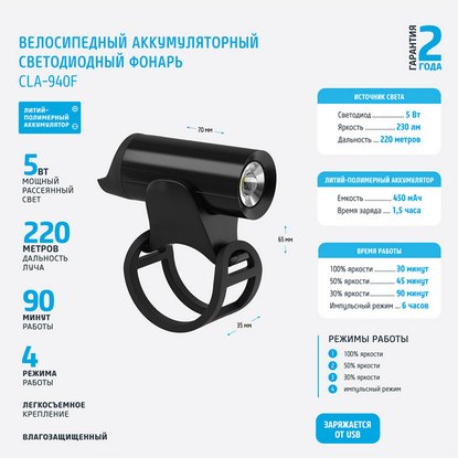 Фонарь велосипедный аккумуляторный светодиодный передний Фотон CLA-940F