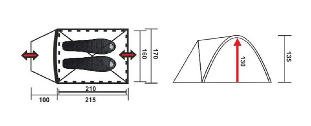 Размеры внешнего тента: (100+215) х 170 х 135 см. Тент изготовлен из полиэстера (polyester 190T) и имеет специальную пропитку, которая придает ему прочность и долговечность, а также защищает от выгорания и преждевременного износа. Водоотталкивающее покрытие тента (PU) – 3000мм. Швы тента проклеены.
