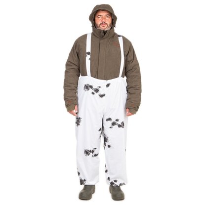 Костюм маскировочный зимний Куртка с разъёмной молнией свободного кроя с капюшоном. Капюшон регулируется по овалу лица и по объёму при помощи шнура с фиксаторами. Рукава-реглан с манжетами на резинке. Прорези в куртке предоставляют быстрый доступ к карманам внутренней одежды. По низу куртки утяжка с фиксатором. Брюки свободного кроя с резинкой в поясе на помочах. Помочи прекрасно поддерживают брюки на уровне талии при движении! По низу брюк манжеты на резинке. ЧЕТЫРЕ РАЗМЕРА!!!