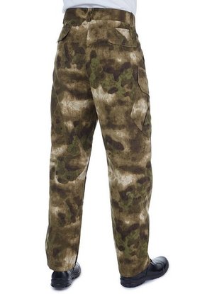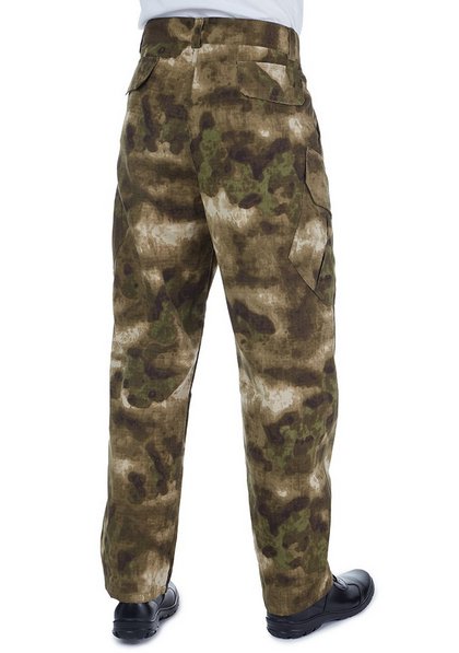 Брюки летние прямого силуэта с поясом со шлёвками. Застёжка пояса на пуговицу, застёжка гульфика на молнию. Два верхних боковых кармана с наклонными входами; два фигурных накладных кармана с клапаном на липучке и со складками для дополнительного объёма; два задних прорезных кармана с клапаном на липучке.
