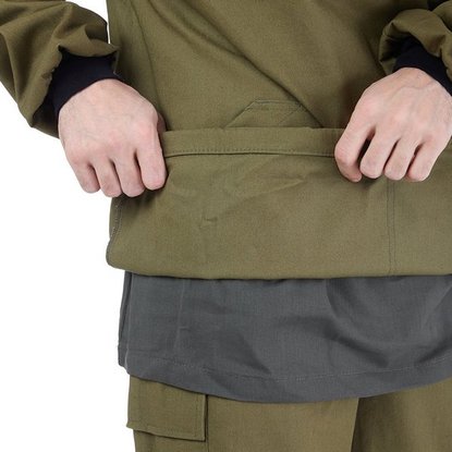 Куртка анорак с противомоскитной сеткой на капюшоне убираемой в потайной нагрудный кармашек с клапаном. Два больших нижних накладных кармана, на рукавах трикотажные манжеты, по низу куртки утяжка.