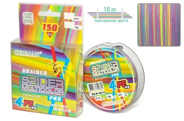 Плетеный шнур German Spider Multicolor x4 150м это 4-ми жильная цветная плетенка намоткой 150 метров. 5 цветов последовательно каждые 10 метров. Круглое сечение. Идеальный вариант для троллингистов. Если у вас нет счетчика на катушке - вы по цвету можете определить отпуск плетенки.