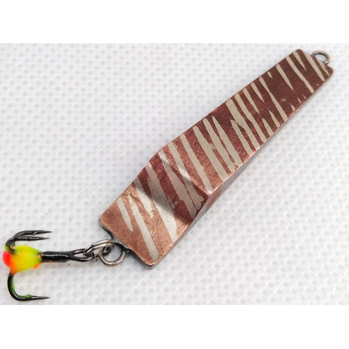 Зимняя блесна ССП (Сибирь Спортивная Полосатая) – это классическая блесна СС в очень оригинальном исполнении Тюменского мастера Денисова. Ему удалось добиться не просто двух цветов с разных сторон блесны, а двух цветов на одной коронке. Оригинальный метод изготовления позволил сделать одну из коронок блесны СС двухцветной, в полоску. Сама приманка по конфигурации очень близка к оригиналу, хотя некоторые изменения в игре имеют место.
